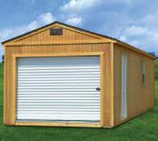 Treated GarageThe Garage comes in a standard 12'-width with two lengths to choose from, 24' and 32'. The garage is design includes the extra high walls. All models feature a 9' x 6'-6" roll up garage door, one metal door, and one 2' x 3' window. It is an ideal large storage solution.