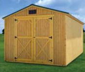 Treated UtilityThe Utility model features the industry standard gable roof. It is available in 8', 10' and 12' widths. It comes standard with 6'-3" walls and can be purchased with the optional extra high 7'-8" walls. The 8'-wide models features a single wood door, the larger models include a double wood door. It does not include any windows. |