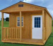 Treated CabinThe Cabin is stylish and practical. It is available in 8', 10' and 12' widths with a gable style roof. Features for all models include a 36" 9-lite door, 3-2'x3' windows, and a 4' front porch. The standard extra high walls make it an ideal solution for a small office, or playhouse. For more upper storage space and cabin style consider the Lofted Barn Cabin.