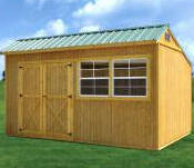 Treated UtilityThe Utility model features the industry standard gable roof. It is available in 8', 10' and 12' widths. It comes standard with 6'-3" walls and can be purchased with the optional extra high 7'-8" walls. The 8'-wide models features a single wood door, the larger models include a double wood door. It does not include any windows. |